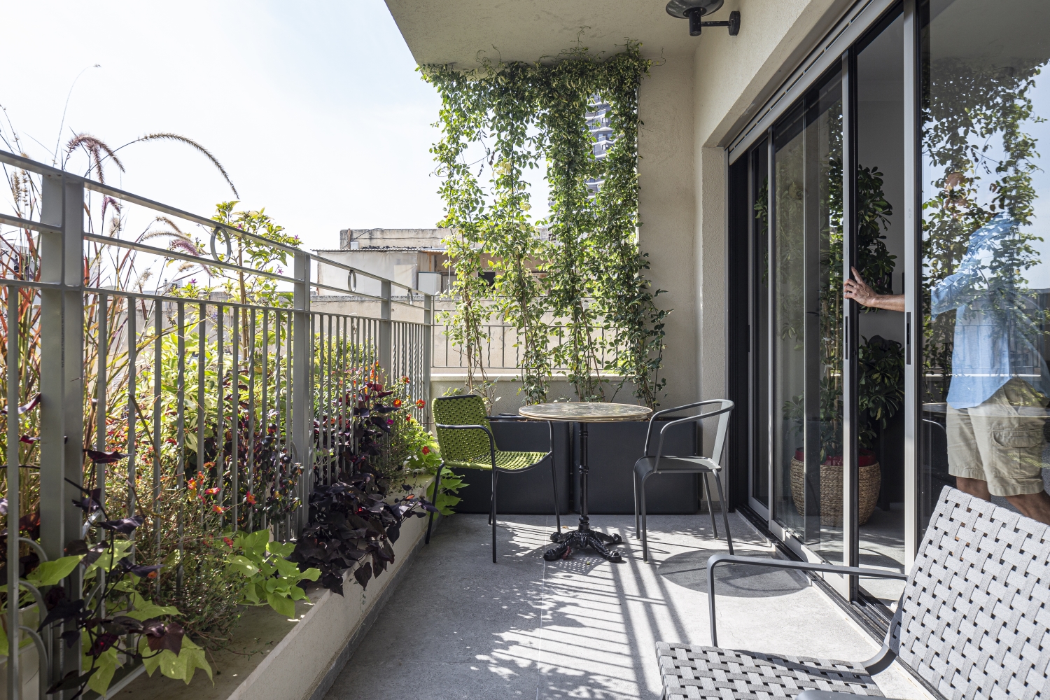 תכנון ועיצוב מרפסת השמש עם צמחיה מגוונת המוסיפה צבע לנוף האורבני ואינטימיות נעימה ליושבים בה.